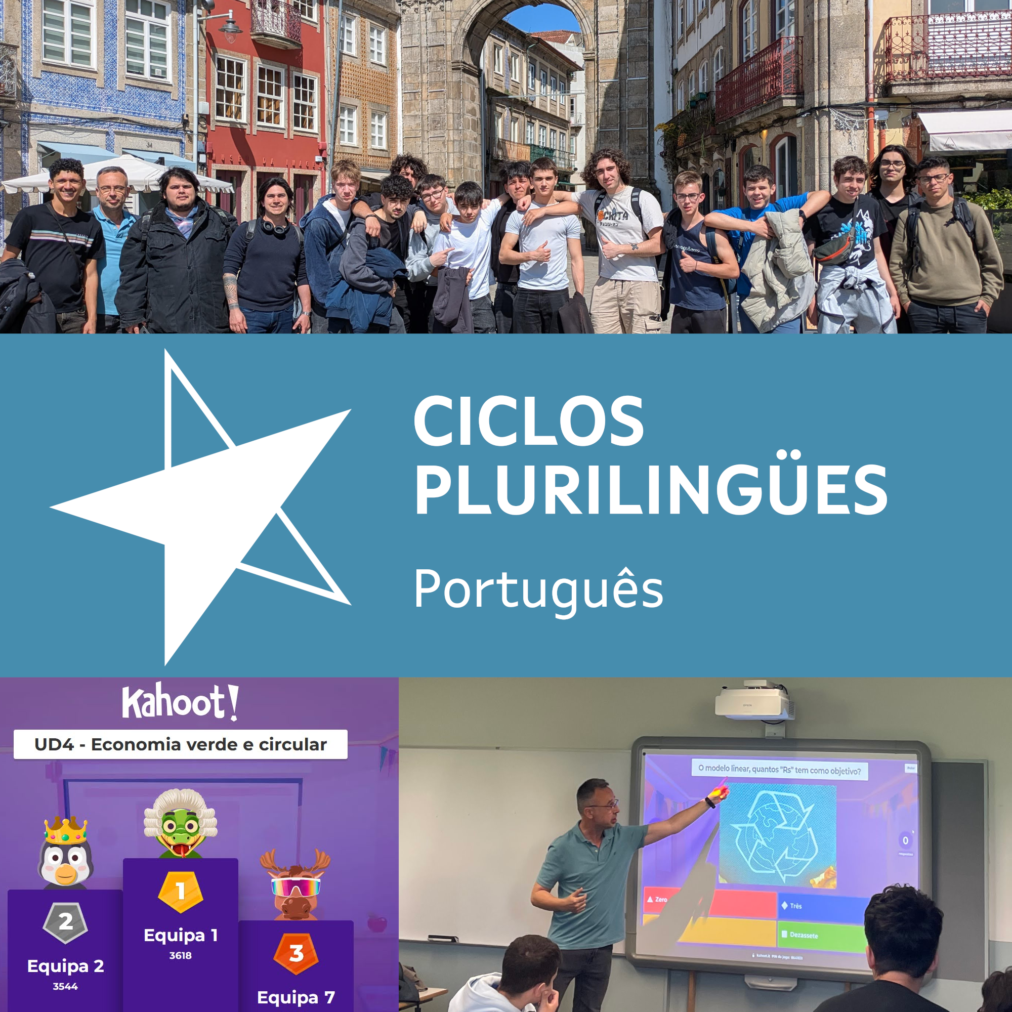 No 22 de abril, 23 estudantes das turmas plurilingues 1SMR, 1ASIR-A e 1ASIR-B, junto com dous professores, realizámos uma atividade colaborativa presencial com os alunos de Informática do AE Carlos Amarante de Braga.